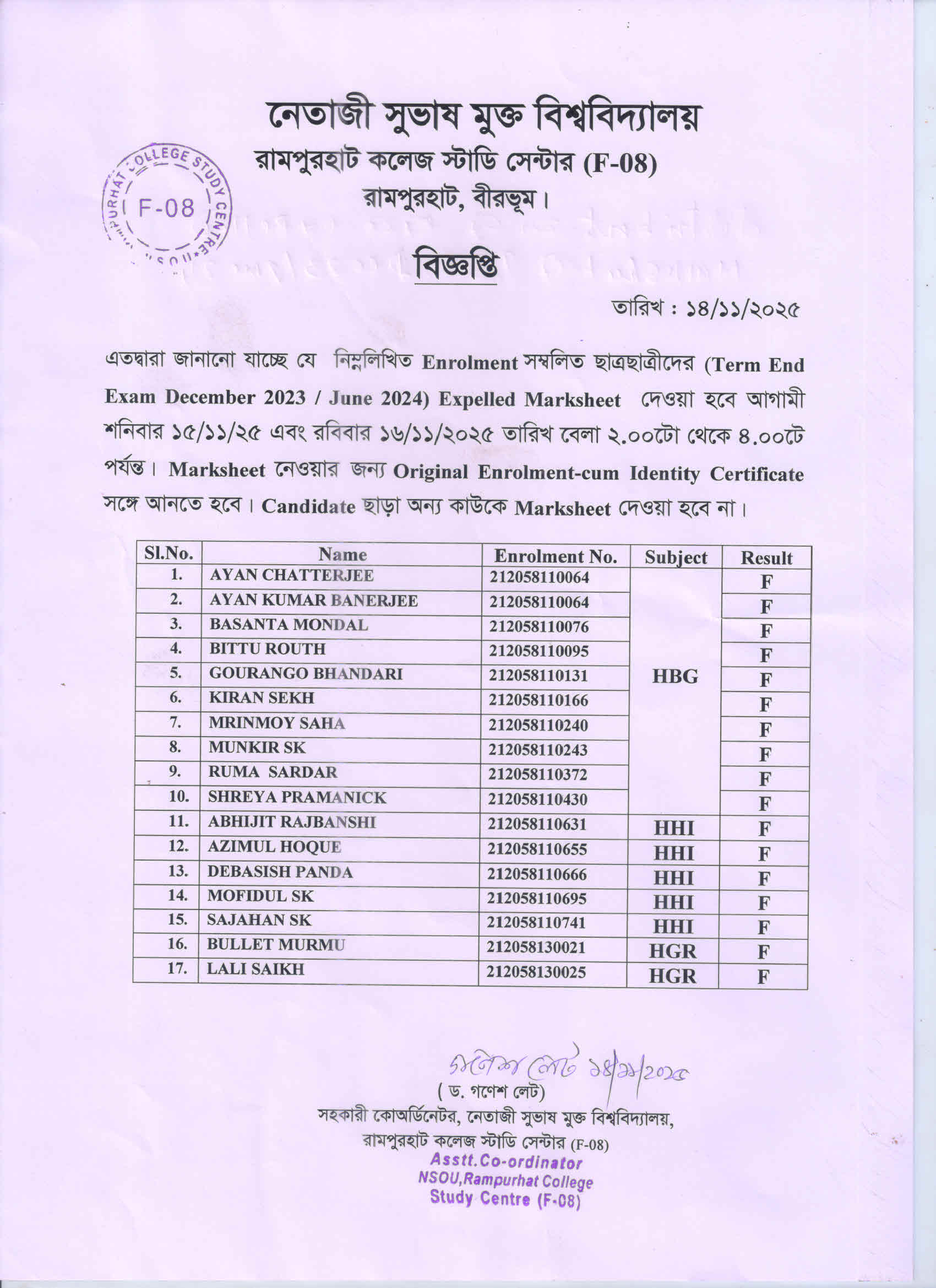 Distribution of expelled Marksheet of TEE DEC-2023-JUNE 2024